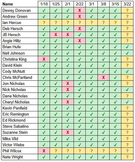 The New Year League starts this Sunday. Teams are not set yet, but they will be in the next couple days. Before we hold our draft I’d like to confirm people’s availability. Most of us registered before the arena shifted our schedule, and a couple people had to be manually added to the league so they were unable to fill out the availability form. Please find your name in the image below and let me know if it accurately reflects your availability. The website form doesn’t allow for a “maybe” status, but “maybe” is okay with me. So if you are unsure of a date, let me know. I’ve inserted “maybe” into the dates where I don’t have information yet, specifically most player’s availability on 3/22 and the people who were unable to fill out the form. You can confirm your availability by either emailing me at leagues@diamondstatecurling.org or messaging me on slack. If you haven’t been added to our slack yet, let me know and I will make sure that happens.